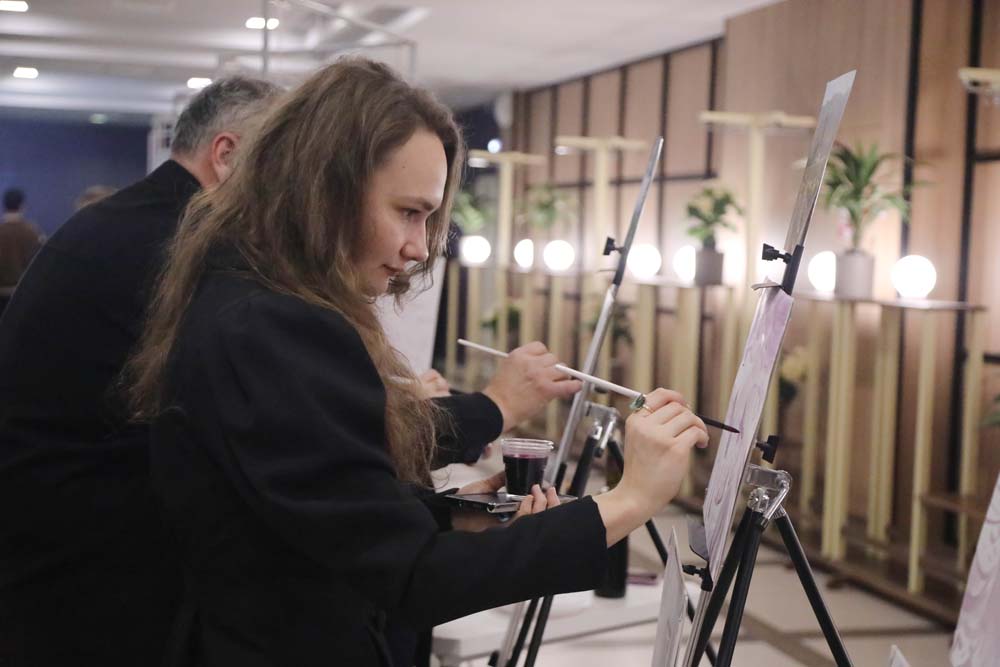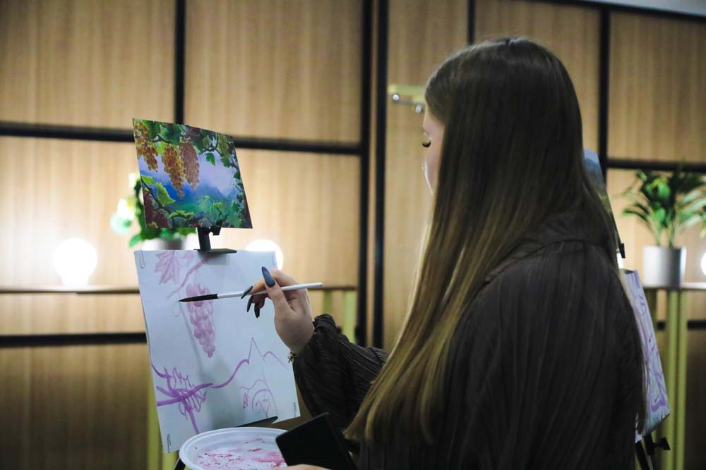 Ещё один уникальный мастер-класс дал возможность посетителям со-вернисажа попробовать свои силы в необычной технике винной гризайли – живописи, основанной на рисовании разными тонами одного цвета, но с использованием настоящего красного вина вместо краски. Никто из участников не остался равнодушным к необычной технике создания картин. Гости, среди которых были и опытные любители искусства, и начинающие рисовальщики, создали множество картин, получив возможность сохранить свои работы в качестве сувенира в память о посещённом со-вернисаже.