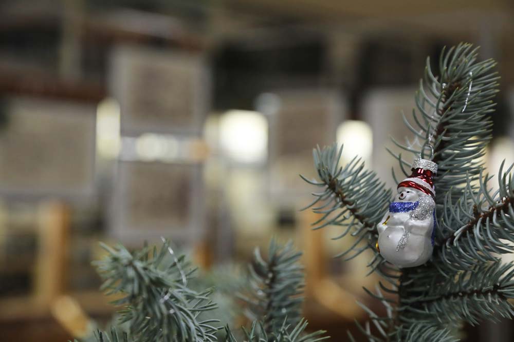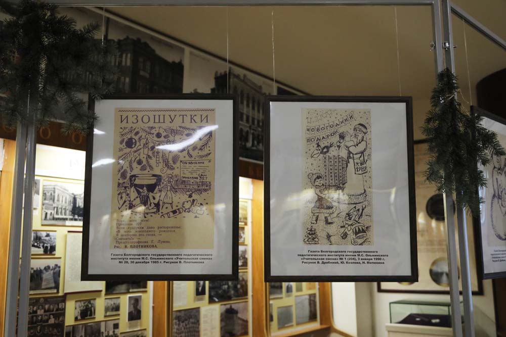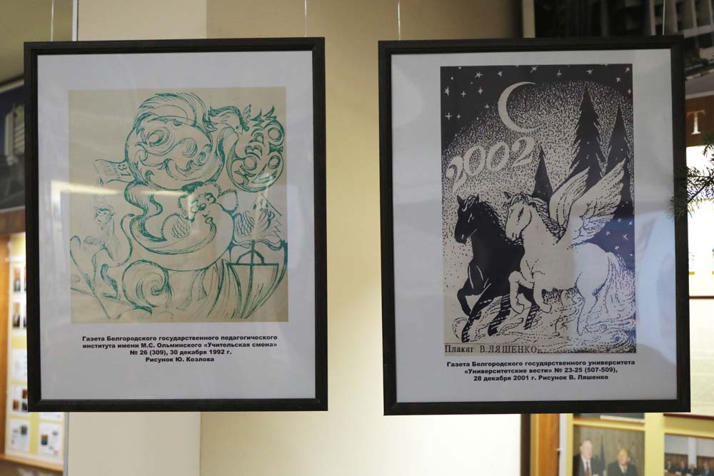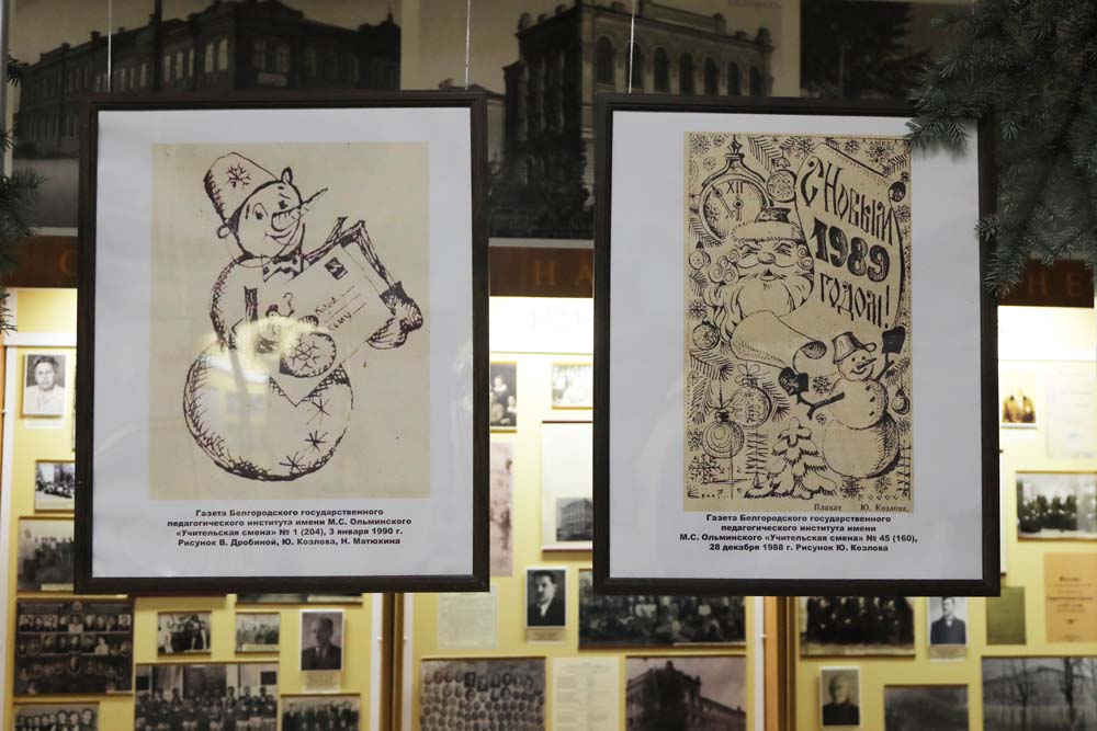 На выставке в Центре истории НИУ «БелГУ» представлены рисованные праздничные иллюстрации к новогодним выпускам периодических печатных изданий вуза разных лет.