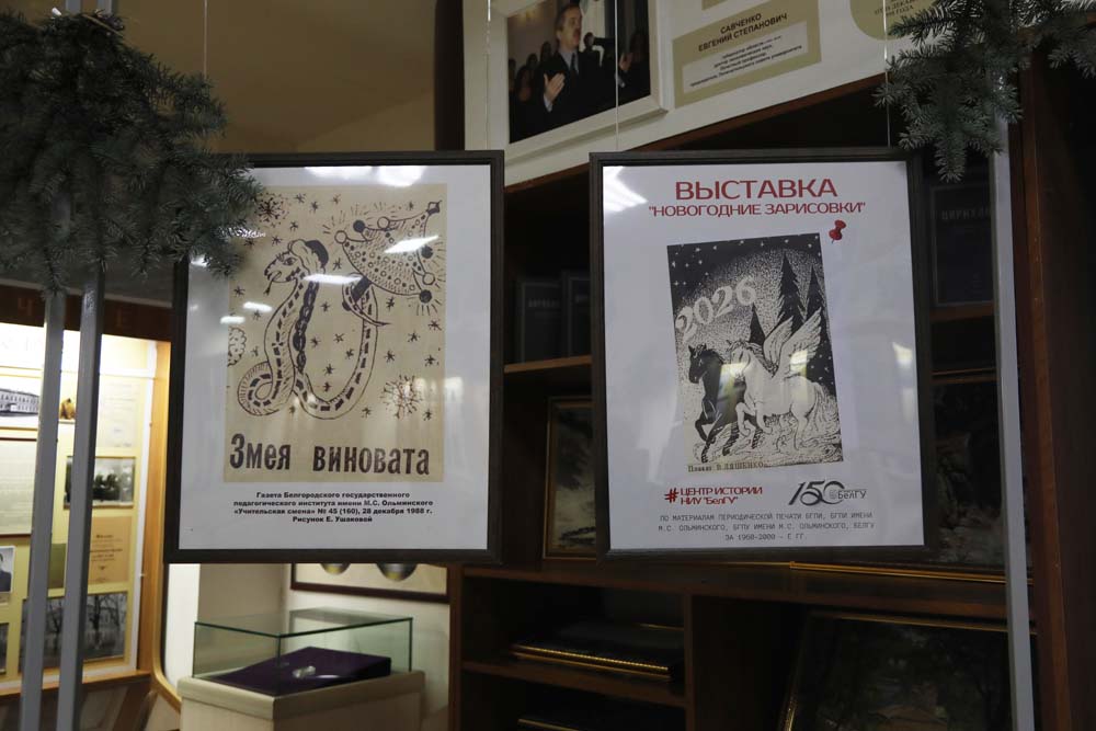 Выставка «Новогодние зарисовки», открывшаяся в преддверии календарного юбилейного года со дня основания университета, создана на материалах периодической печати Белгородского государственного педагогического института имени М.С. Ольминского, Белгородского государственного педагогического университета имени М.С. Ольминского и Белгородского государственного университета. В экспозиции представлены новогодние иллюстрации разных лет.